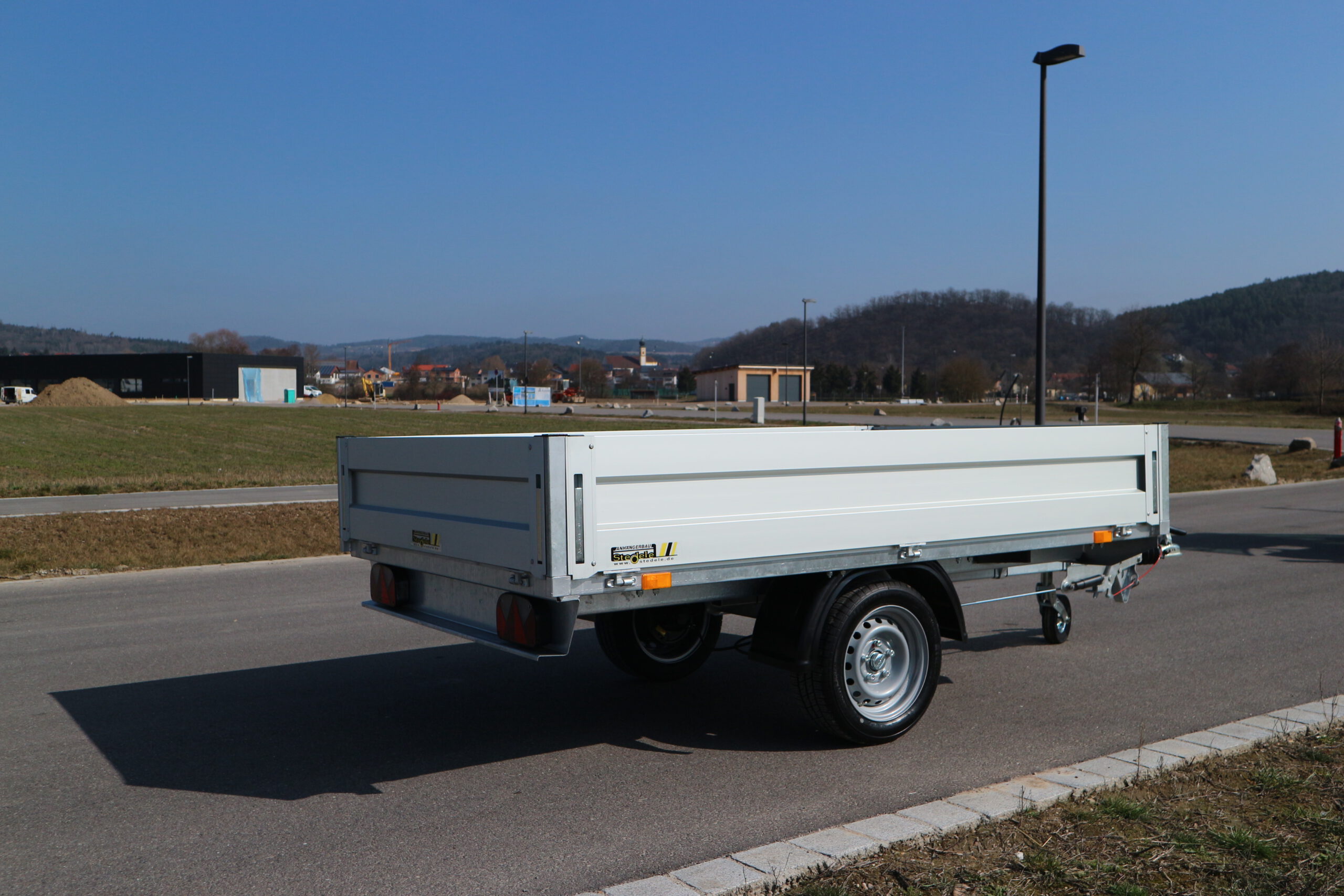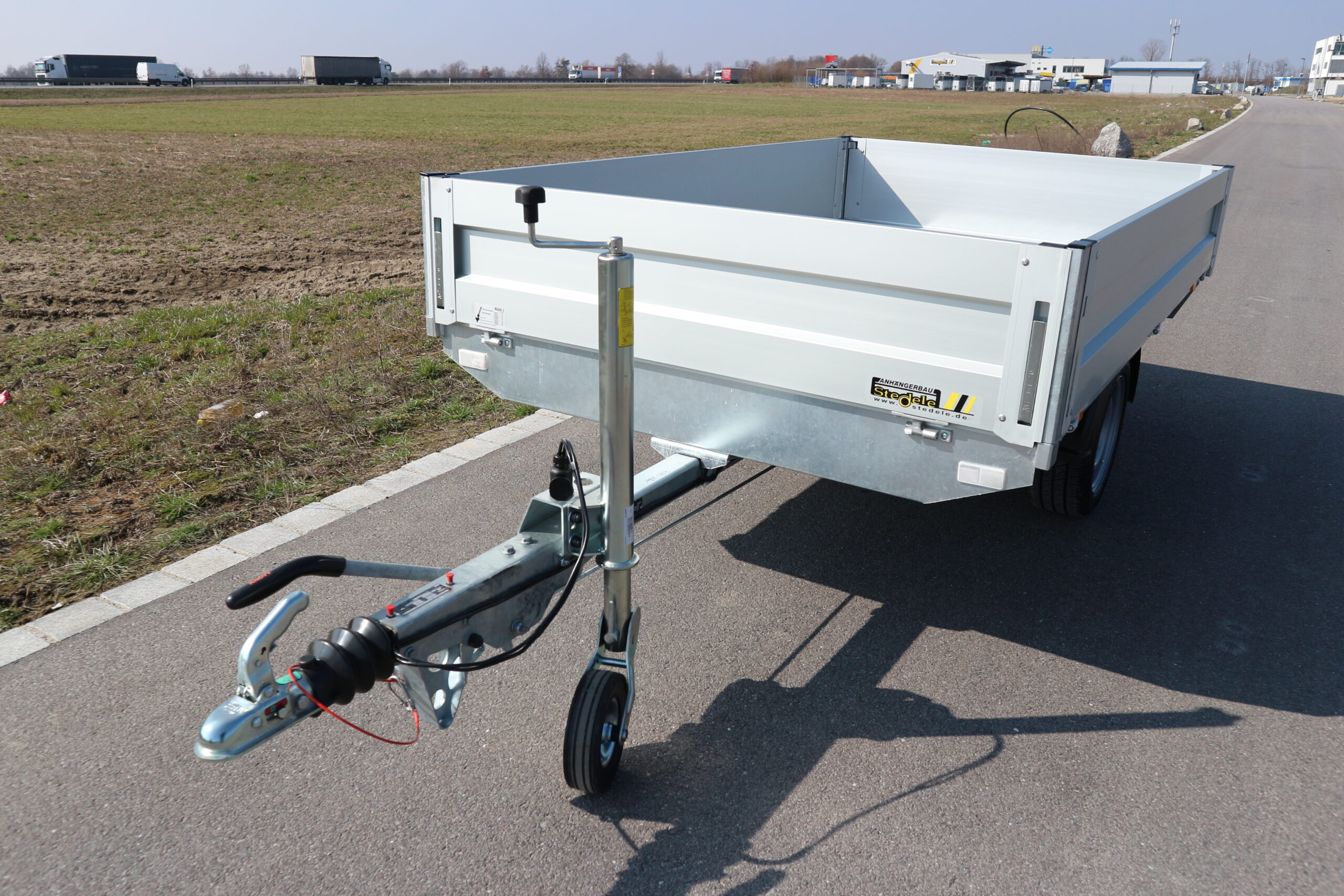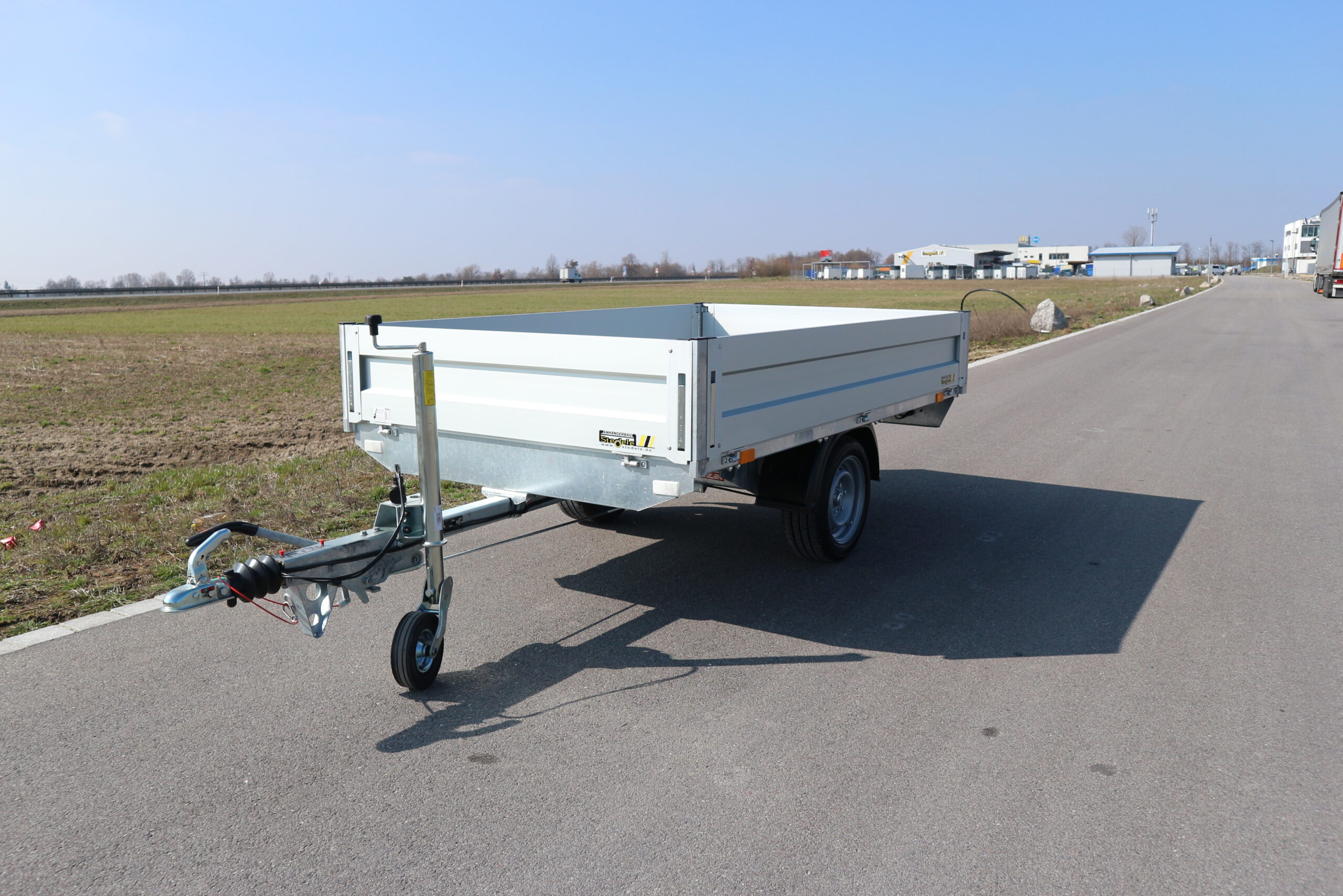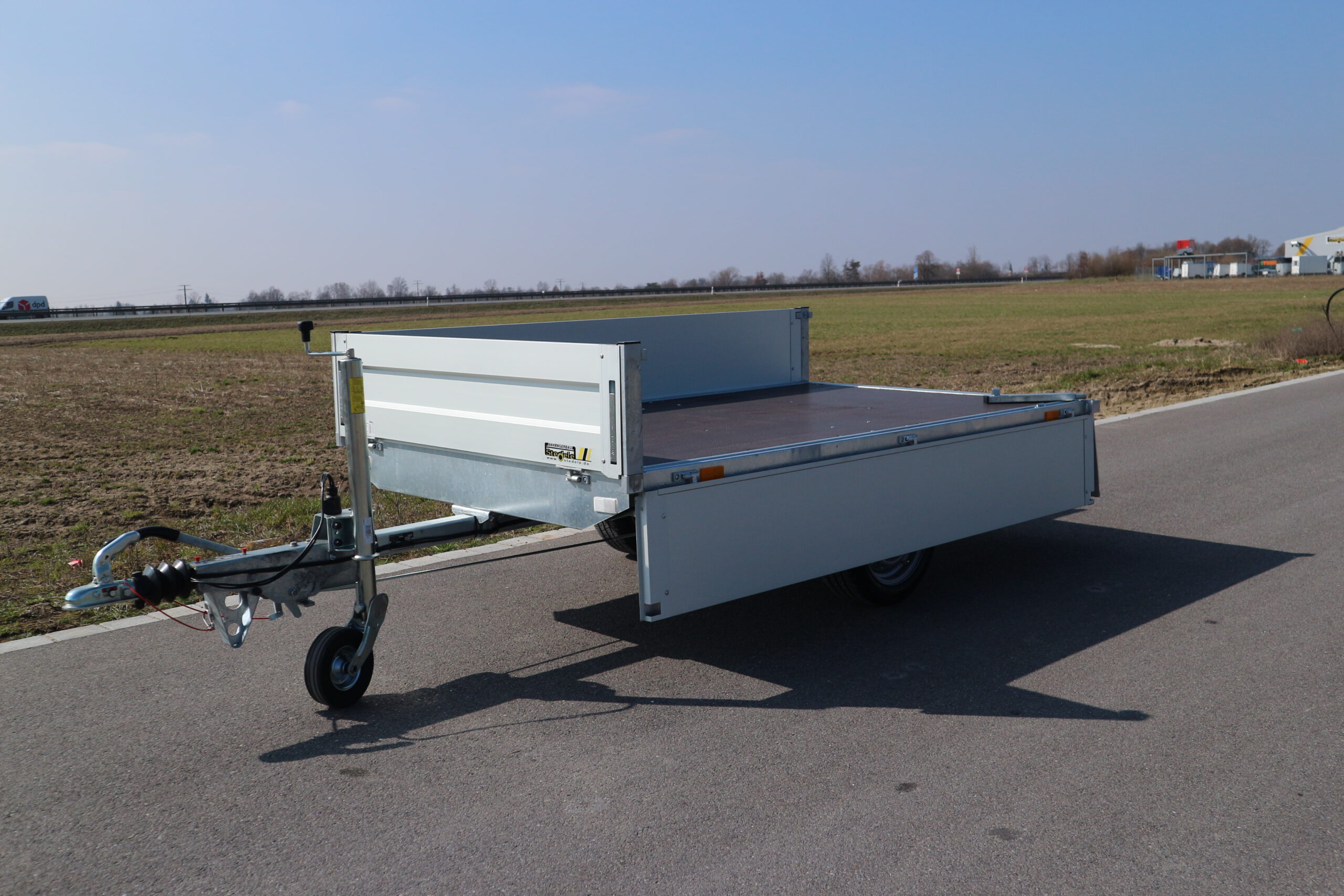Serienmäßige Ausstattung: Wartungsfreie Gummifederachse mit massiven feuerverzinktem Achskörper und robusten Auflagen. Einzelradaufhängung für schönsten Fahrkomfort. Wartungsfreie wassergeschützte hochleistungs Radlager. 2 Rad gebremst mit Rückfahrautomatik und Feststellbremse. Asbestfreie Bremsbeläge, Innenteile der Radbremse galvanisch verzinkt. Kunststoffkotflügel stoß- und bruchsicher. Massive Stahlrohrdeichsel für mehr Wendigkeit beim Rangieren. Sicherheitskupplung mit Automatikverriegelung und Verschleißanzeige. Bodenplatte aus mehrfachverleimter wetterfester Siebdruckplatte 18 mm stark. Aluminium Doppelkammerbordwand eloxiert. Aluminiumbordwände. Höhe 35 cm – an allen 4 Seiten abklappbar und abnehmbar. 8 Zurrbügel zur Ladungssicherung. Beleuchtungsanlage nach StVZO geschützt im Leuchtenträger montiert mit Stecker 13 pol. und Rückfahrscheinwerfer.